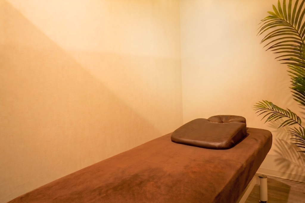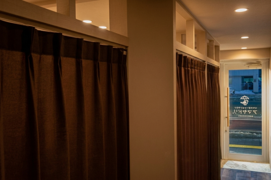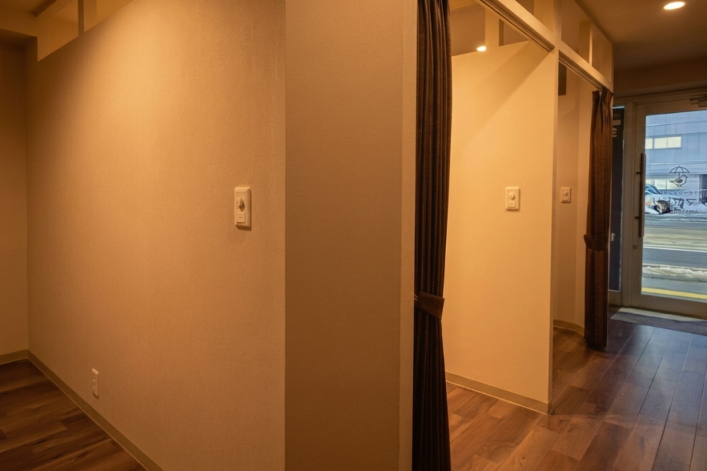 カーテンに被せるように部分的に壁をつくることで隙間をなくし、お客様が安心して施術を受けられるようになりました。